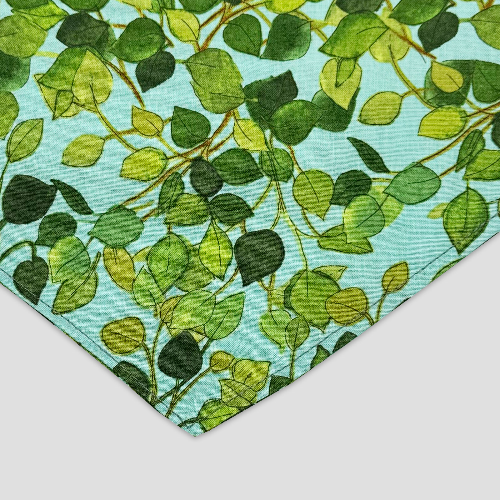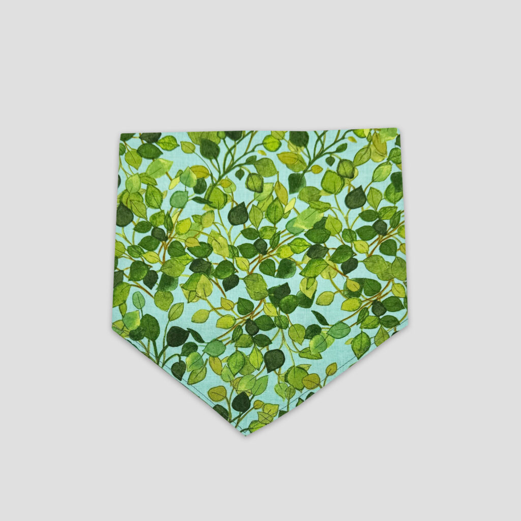 The Through The Trees dog bandana features a leaf pattern on a green base.